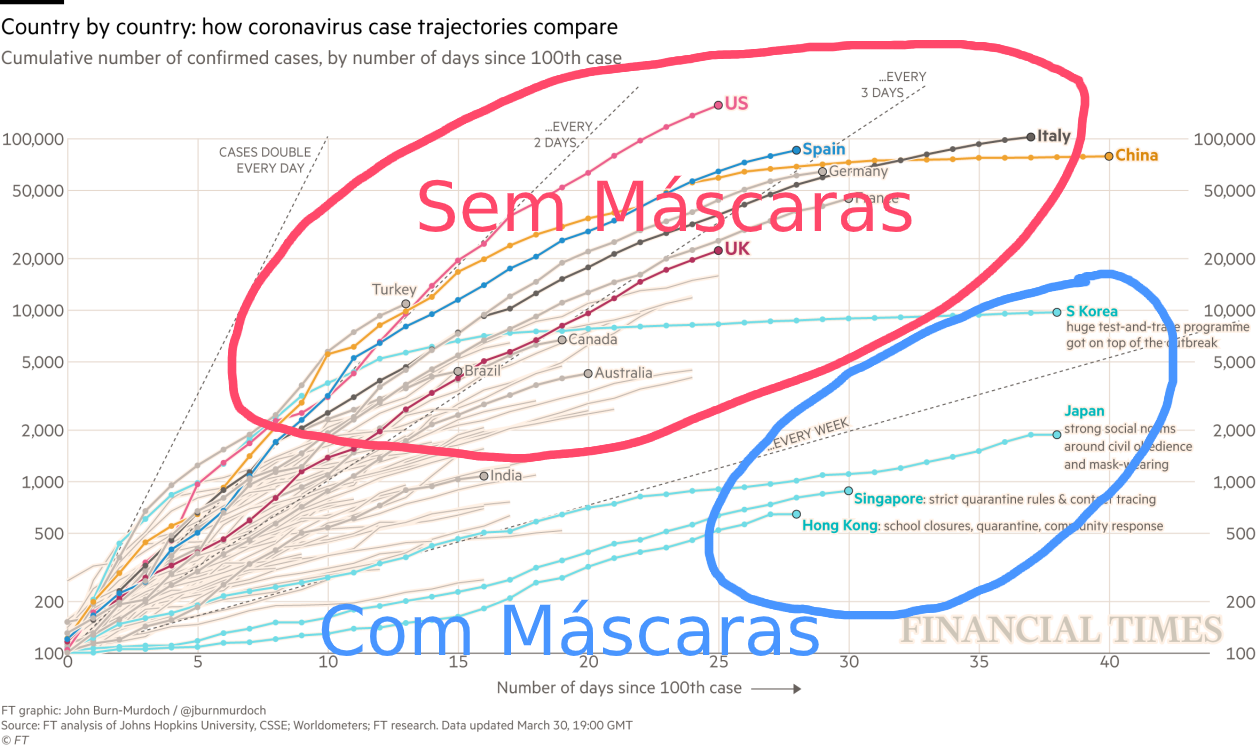 Os países ocidentais estão vivendo maiores taxas de infecção por COVID‑19 comparado aos países do oriente, principalmente devido a aversão do ocidente ao uso de máscaras.